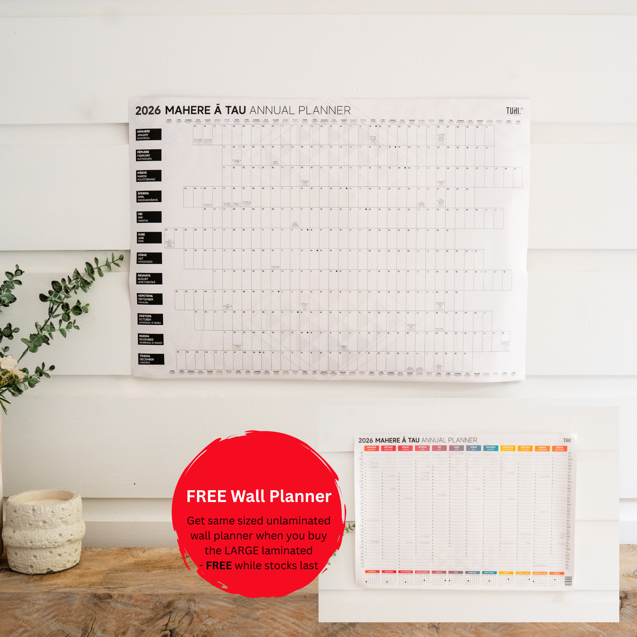 Keywords for SEO: Māori 2026 wall planner, bilingual Māori English wall planner, Māori calendar 2026, maramataka wall calendar, Māori public holiday calendar, Māori annual planner, 12-month Māori wall planner, te reo Māori wall planner, Tuhi Stationery Māori planner, Māori design wall calendar, Māori language annual planner, cultural wall planner NZ.